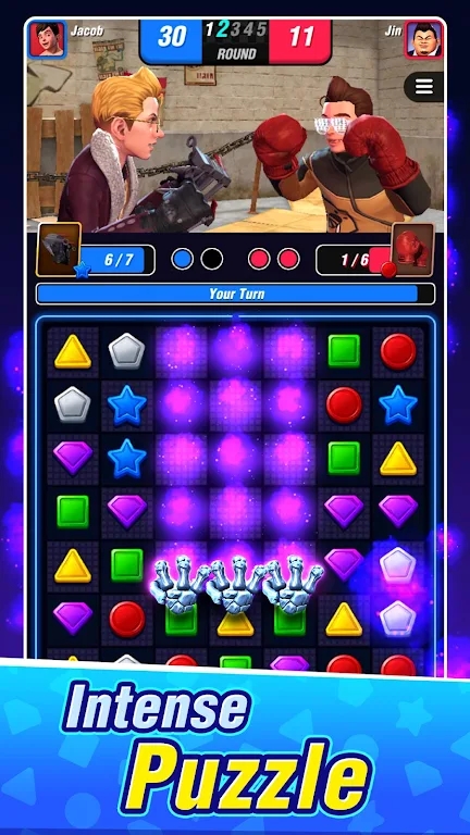 1、玩家需要通过消除相同的拳击手套来发动攻击,消除的手套越多,攻击力越强。