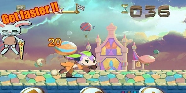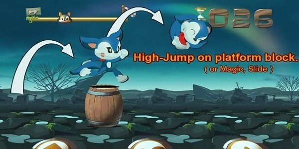 1、玩家通过触摸屏幕控制小狼的跳跃力度和方向,躲避障碍物,收集游戏道具。