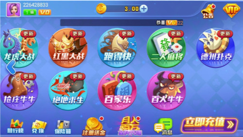 卡片斗牛规则首先比较卡片的类型,然后比较大小。顺序如下:炸弹 5 小金牛 银牛 斗牛 9 公牛 8 公牛 6 公牛 5 公牛 4 公牛 3 公牛 2 公牛 1 公牛 公牛破发后,数字比较:国王>小国王,K,Q,J,0,9, 8, 7, 6, 5, 4, 3, 2, 1和花哨的比较:黑桃,红色,桃花和草花的正方形。斗牛是由四名球员进行的,一名是银行职员,另外三名是球员。遵循纸牌斗牛的规则,玩家首先将筹码扔到桌子上。掷出筹码后,发牌。最后,玩家越来越大。